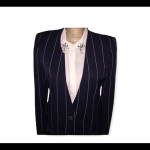 Navy blue skirt suite. Has pockets on the skirt and blazer. Has discoloration inside jacket as shown on picture. Outside in perfect condition.