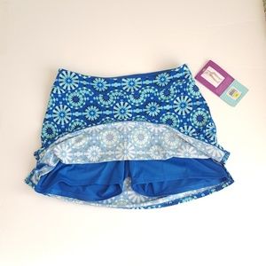 Blue floral skort by Colorado Clothing. Perfect for tennis or golf. XS is 14 1/2" long, Small is 15" long, Large is 16" long. The last photo is Colorado Clothing's size chart for waist and hip sizing.