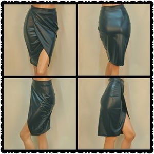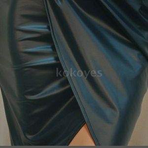 Deep green, high waist wrap style split skirt. Goes a little below your knee. Will vary according to height and how you place it on your waist for the most flattering appearance for you.