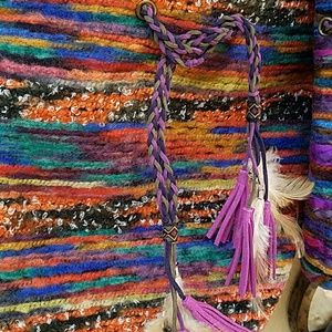 Hot, retro look carpet bucket bag with feathers, leather tassels, leather braided pull closure and crossbody strap, inside pockets for keys and cellphone, zipper compartment inside 11x11x7 wide with 21"drop. Braided leather pull weaved throughout top of bag. Includes dustbag.