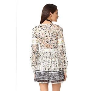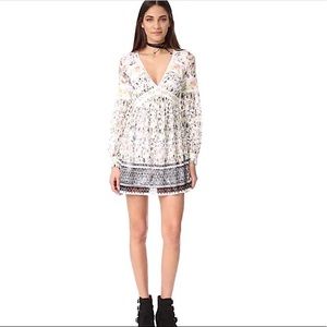 super cute Free People Lace Blossom plunging v-neckline long sleeves Mini dress, woven embroidered stripes, delicate pleats accent the skirt, long sleeves with button cuffs, hidden side zip, lined. NWT