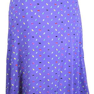 Vibrant periwinkle-purple A-line skirt with multicolored oval polka dots. Fully lined Side zip.