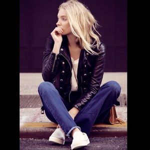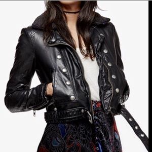 Free People black Vegan Leather Remove Faux Fur Collar Belted Moto Jacket lined