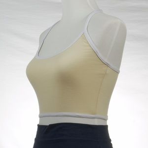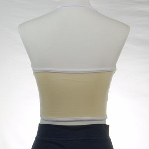 Comfortable stretchy cotton blend halter top in creamy beige and creamy yellow.