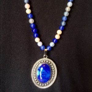 A beautifully detailed silver-toned pendant showcases a large blue oval resin cabochon stone lending a southwestern flair. The 3" pendant is displayed on a 36" beaded necklace featuring gorgeous blue agate beads, gray agate beads, and silver pewter beads. Additionally, a 3" extender adds versatility to the length of this lovely piece and is secured with a silver plated lobster clasp.