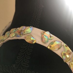 In great condition, I believe it was used only once and has been stored in plastic. Only issue is a few jewels have fallen off but it is an easy fix. No other issues. No stains. No rips. The zipper works just fine. Really a beautiful dress! Size 4, measurements upon request.