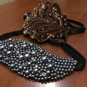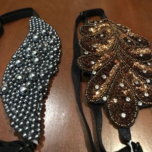 Beautiful headbands! The silver is embedded with silver pearls/beads and a hint of rhinestones. The bronze one is embedded with sequins rhinestones through out both are adjustable in size. Very good quality!