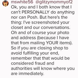 @hshae1 I’m glad. I got burned bad, and she has had all the time in the world to rectify the situation choosing not to. I reported her to Posh too.