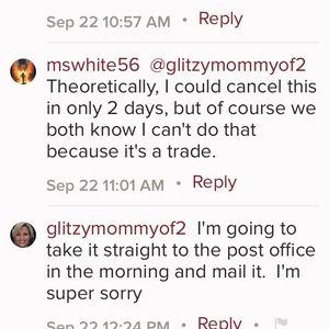 @angelap711 I traded her 3 items of mine , she kept them and would not send what I'd traded for! Shes a scammer!