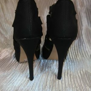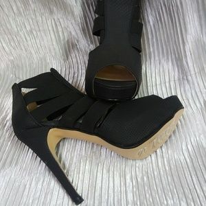Black Color, Five Elastic Straps on both sides for easy slip on and off. Slightly padded Footbed. Heel Height 4.5" inches approx Platform height 1.5" inches approx.