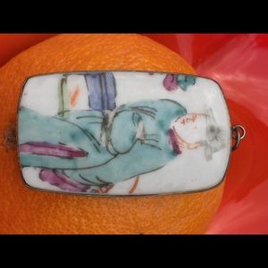 Here we have a beautiful large vintage sterling Asian ceramic hand painted pendant.