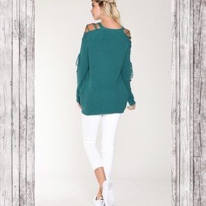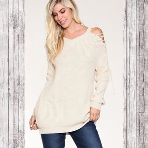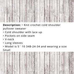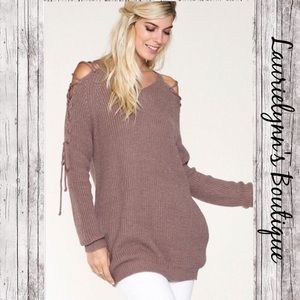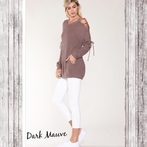 Gorgeous, light knit crochet cold shoulder lace up long sleeve pullover sweater. Pockets on side seams. Available in dark mauve. As seen in first and last picture
