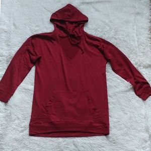 Super Cute BURGUNDY hoodie sweater dress with cutout in front. Very comfortable. Thin/Lighweight Material/Semi-Sheer.