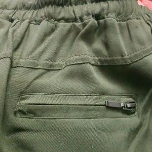 Look stylish in this olive green cargo jogger pants made of Rayon; size 2x which fits sizes 18 -20. It features a drawstring waist, (unstretched 35 in. to streched 41 in.) 2 side pockets, 2 pockets on th leg of the pants and 1 zip pocket on the backside of the pants. It has been worn twice. There is a little piling on the inner thigh as seen in the picture. I removed it out of storage again to take pictures of me wearing it; as a result it is wrinkled. It will be steamed again before shipping.