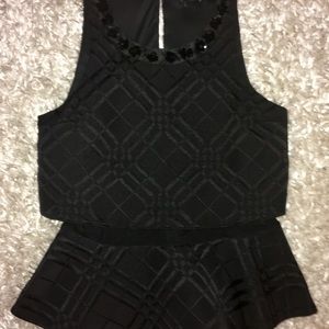 Beautiful black flower sequins trim the scoop neckline•2 inch mesh panel divides the peplum•a beautiful 3D pattern woven through the entire top•back open slit with eye hook closure•Sz SMALL
