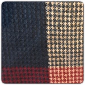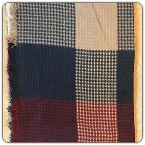 Look gorgeous & stay warm this season in this beautiful plaid waffle knit blanket scarf. Makes a great gift. Burgundy, navy, tan & cream 100% acrylic with frayed hem. 79” x 28”