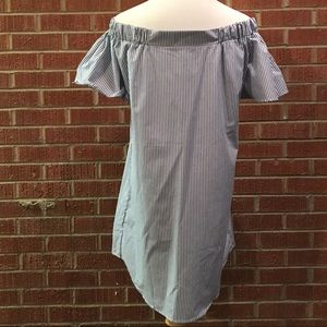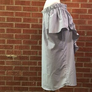 Brand new without tags. Size medium. Right on trend with the off the shoulder style- plus ruffles!! Longer in the back and a beautiful blue and white stripe. Style Envy striped off the shoulder ruffle top.