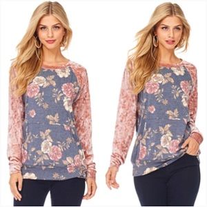 Scrumptiously soft floral top with blush crushed velvet sleeves & kangaroo front pocket against a heather gray background. Stretchy 82% polyester - 15% rayon - 3% spandex. Looks great with all denim! Made in USA