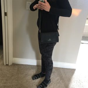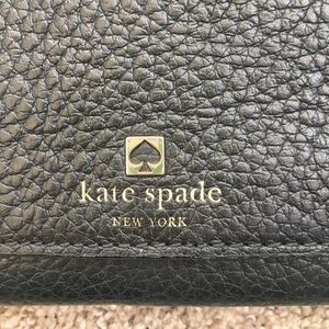 Small Kate Spade over the shoulder bag in black with gold brand stamp on front and cute striped interior. Three slim interior sections plus card slots so you don't have to bring a wallet. Perfect bag for a hands free night on the town. Only used once, so it's in really good condition.