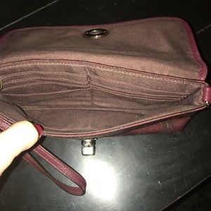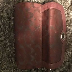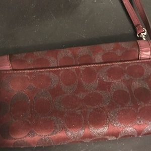 Maroon/ garnet large wristlet. Coach signature fabric with turn-lock closure, 8 card slots inside with big pocket and back pocket on the outside.
