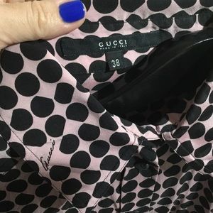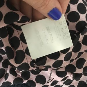 Worn once and in mint condition! Pink and black polka dot button down. 87%silk and 13%spandex. Made in Italy. Marked EU38. Bust 32”, waist 30”, sleeve 25” and length 23.5” Looks great with plain skirts and pants or jeans for casual cool look. Logo all over the shirt with designer buttons. Please zoom in for closer look. It’s one fabulous piece to own.
