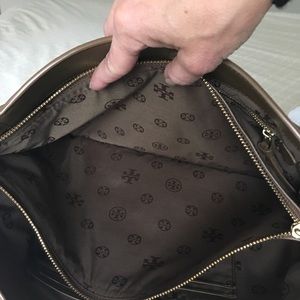 Tory Burch Marion Suede Chain Shoulder Slouchy Tote. Beautiful brown suede (color is called River Rock). Classic Tote with whipstitch trim. Convertible chain & Leather shoulder handles, 9”-16” drop. Open top with magnetic closure. Embroidered logo detail at center. Fully lined interior with center zip compartment, one side zip and 3 slip pockets. 10”x13.5”x5”. Used once. Excellent condition. Comes with tags & dustbag. I noticed there is a dark spot on one of the corner stitches..see photo