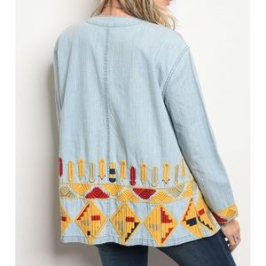 Long sleeve light denim jacket with aztec tribal southwestern embroidered details. Has pockets! Lightweight chambray-like material. 100% cotton. Last picture is a very similar jacket for style/inspiration purposes only. Pictures 1, 2, 3, and 4 are of actual jacket for sale.