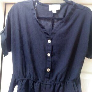 Stylish black short sleeve top with button-up front. Features a tie waist for a flattering fit.