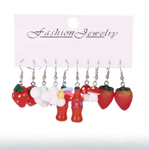 5-Pair Resin Earring Set – Cute Strawberry, Soda, Mushroom & Cloud Dangles