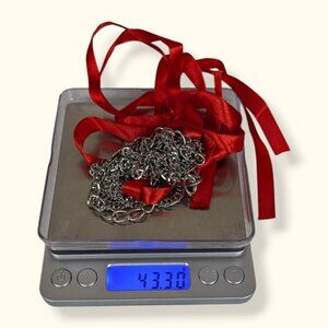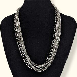 This 5-strand necklace is made of a silver tone metal and has a doubled ribbon on either end that ties in a bow behind the neck. The strand are all made of silver tone metal chains and come in a variety of sizes and chain types. The necklace can be worn with a casual outfit or with something a little more dressed up. There is normal wear, but the only thing affecting wearability might be the ribbons. When stored in a bag they can get a little wrinkled so I would recommend ironing them and then hanging the piece somewhere that the ribbons won't wrinkle so it's ready to wear again. For reference, about 1/2 to 2/3 of the necklace is the ribbon, not the chain.