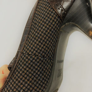 These brown tweed Mary Janes by Hot Kiss are a classic chic! With a 3" heel, your feet will last the day with no troubles! A hint of vintage, they feature a brown/navy/gold tweed pattern with a hint of sparkle and a brown snakeskin pattern on the rest. They do show wear; although rarely worn with soles and insoles showing minimal wear, they've been with me for awhile, and even life in my closet has some effects! See last 3 photos.