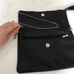 Black faux soft leather shoulder bag. Two zipper compartments. Cute tassel. Inner magnet closure. And removable chain. Chain is somewhat beat up but can’t tell because of the material it’s made of shown in pics. Also you can dress it up by removing the chain and throwing in under your arm for night out.