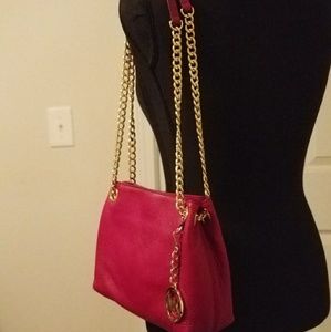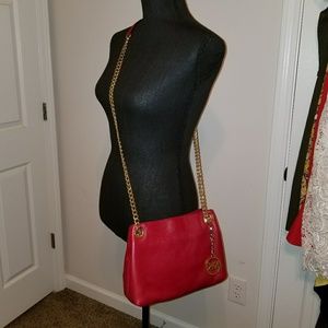 "JET SET" RETIRED Red leather, Michael Kors convertible shoulder/cross body bag with gold chain straps, 2 inner compartments and zippered pockets.