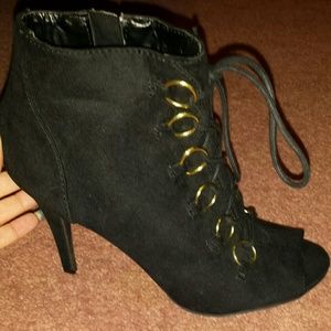 size 7. Candie's heels! open toe, black & gold. super cute, I wish they fit! Just need a wash down as they've been sitting in storage.