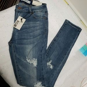 Blue jeans MID-WAISTED skinnys, with the destroyed look to them. Light fading details and camel stitching. These have lots of stretch and will be your fave jeans to wear.