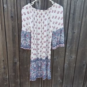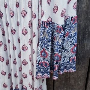 Only worn and washed once and in like new conditon! Marked as an XS, but has a looser fit (more of a small?) The top has elastic and the fit is very flowy. Boho chic. Trumpet sleeves. 100% Rayon. Bought from Macy's. I'm 5'4", size small for reference :)