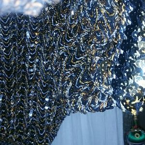 Holiday party time! Sparkle in this batwing beauty. Loose thread on right sleeve, see pics for details. Sleeve cuff to cuff is 50 inches meant to rest at elbows, back neck to hem is 19 inches, Elastic waist stretched is 20 inches. PLEASE NOTE: Vintage items are often sized smaller & may have imperfections which add to the character & unique details. Check your measurements!