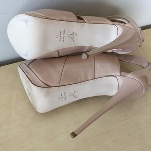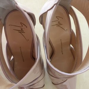 Giuseppe Zanetti light beige patent leather platform heel sandals shoes brand new in size EU38 or US8. There's some small black dots on the right side of the shoes. If you take it to a professional clean they may be able to remove the dots. They are barely noticeable when you wear them. Comes with dust bag and original box.