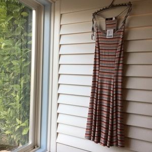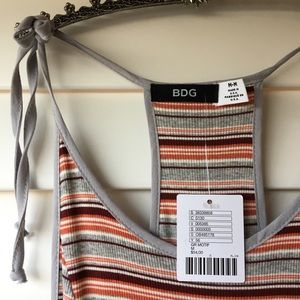 Super adorable NWT UO BDG striped dress! burgundy, orange, white, and gray stripes. ribbed and two seams going down the front. ties on straps, can be untied and adjusted to comfort. stretchy material. modeled in another color (pic 5). No flaws - absolutely love this and at a great price! Price Firm🤑 Please let me know if you have any questions😊
