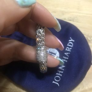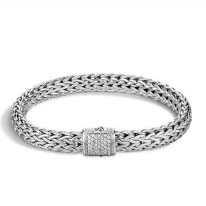 “SOLD IN OTHER APP” guarantee this is an authentic JOHN HARDY Sterling Silver Diamond 6.5mm Classic Chain Bracelet M or 100% of your money back. This stunning sterling silver bracelet from John Hardy's Classic Chain collection features signature hand-woven chain that drapes smoothly and supplely to follow the contours of the body. The clasp of this bracelet is studded with brilliant pave diamonds weighing approximately .16 carat total weight. Width: 6.5 mm