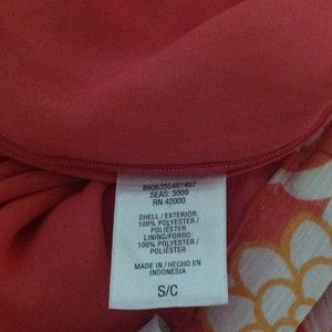 Pink, orange and white flower skirt. With left side zipper. Elastic in waist but only on the sides. 100% polyester shell/lining. The skirt still has life in it. In good pre-owned wear condition. Pics do show the snags in the skirt