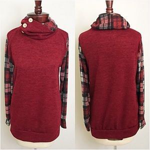 Be pretty in plaid! Gorgeous burgundy, black & white plaid tunic top. Cozy cowl/turtleneck with button detail. Made in USA 95% Polyester 5% spandex knit