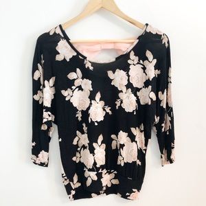 Super cute black, pink, and cream floral shirt with pink bow in back. Rue 21 size small. Great condition!