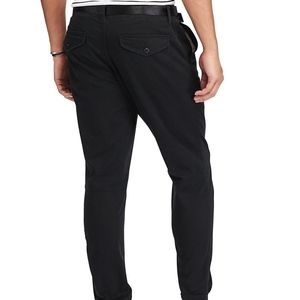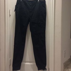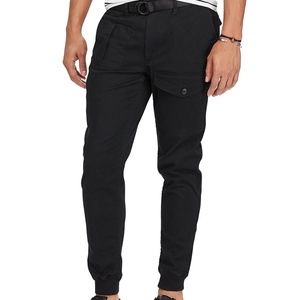 Up for sale is a pair of Men's black Stretch Straight Fit Twill Joggers with elastic ribbed cuffs on the bottom of the pant. It has a zip fly with a buttoned closer with two front pockets.Great for casual wear/and skating