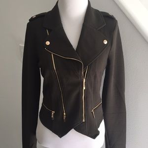 Brand New with Tags!!!! So obsessed with these jackets!!! Excellent quality and material. Gold zipper and button details!! 92% Polyester 8% Spandex