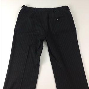 Calvin Klein Charcoal Gray Pin Striped modern Fit Pants. Women's Size 2. Zip with bar and hook and two button closures. Row front pockets. Back pocket on right side with a loop and button fastener. Dry clean only. 67% polyester, 31% rayon and 2% spandex. Measurements are approximate. Waist: 32", rise: 8.5", inseam: 32".