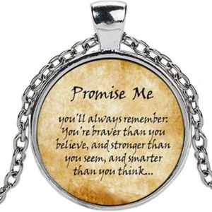 Brand new in original packaging. "Promise me you'll always remember you're braver than you believe, and stronger than you seem, and smarter than you think" inspirational quote within a glass dome cabochon. Accented by the bronze, silver, gold or black metal, this handmade necklace is a statement & reminder of love! Weight:20g. Link chain:45 + 5cm extender (adjustable). Pendant: 2.8x2.8cm. Lobster clasp. All sales are final, please ask all questions prior to purchasing!