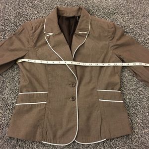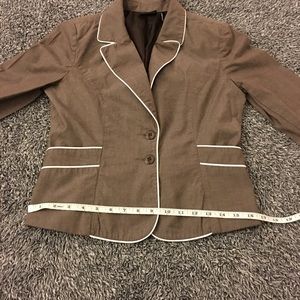 Cue lil' jacket that can be worn so many different ways & with so many outfits G8 shape & SF. Lovely pleated detail on the back & adorable white trim. No flaws worth mentioning so there shouldn't be anything major/obvious wrong with this blazer. I may have missed something but that just means it's not noticeable! Please see pics for details, condition & measurements. Tag says med. but I'm thinking it must be a Jr. Med. then since it fits closer to a women's fitted small. Questions? Ask! Offers👍
