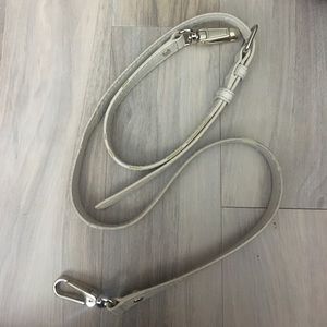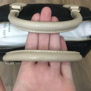 Black leather purse with cream handles/straps and striped interior lining. Interior has one zipper pocket and two smaller pockets perfect for phone or other small items. Crossbody strap clips on/off easily. Handles repaired under warranty and remain in perfect condition. Signs of wear can be found on the crossbody strap and the zipper tab. Not very noticeable, so I have not had repaired. The “d” in logo shows wear from how the bag naturally sits when not full. Unknown spot on back, see photo.