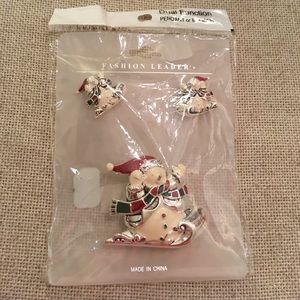 NWT Enamel Snowman On Sled Pin/Pendant Earrings